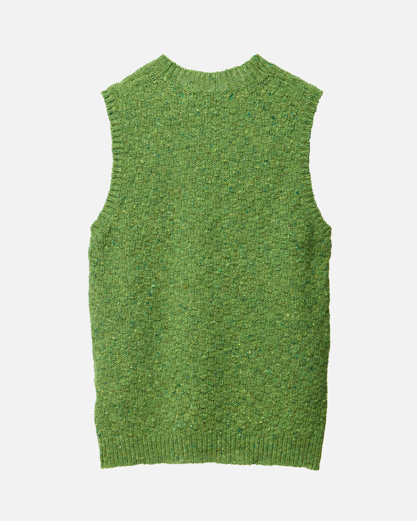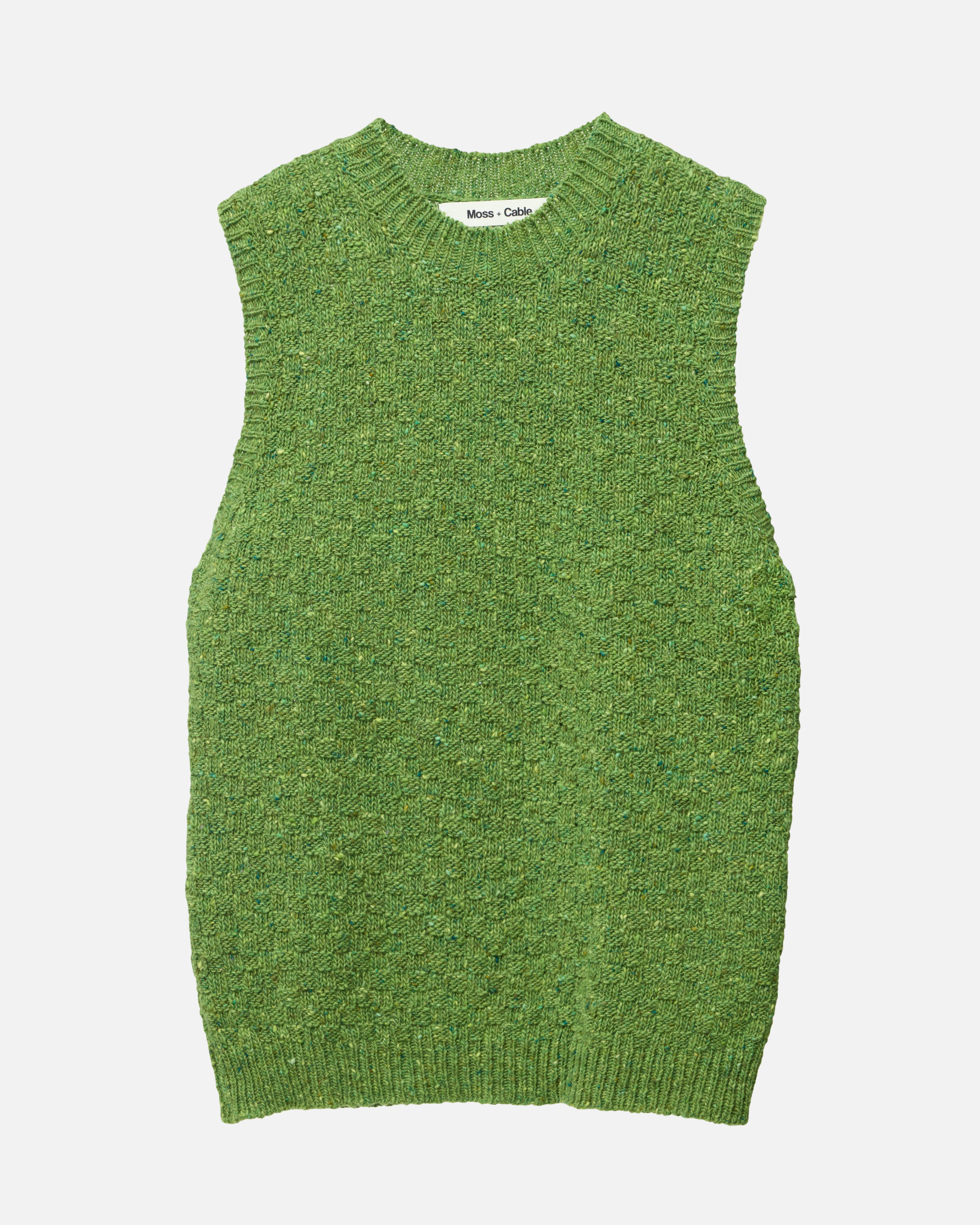Knit in an all-over basket stitch and made from locally spun merino yarn, our new knitted vest is the perfect addition to your transeasonal wardrobe.